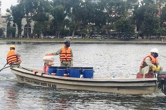 Hà Nội làm sạch nhiều hồ trên địa bàn bằng chế phẩm Redoxy-3C. Ảnh: Tiền Phong |