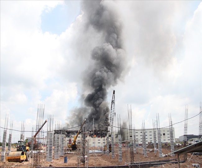 Lửa bao trùm tòa nhà công ty Công nghiệp DSVK, chuyên sản xuất ghế sofa tại khu công nghiệp Sóng Thần 3 (phường Phú Tân, TP.Thủ Dầu Một, Bình Dương). Nhà xưởng rộng 16.000m2 bị cháy khoảng 4.000m2.