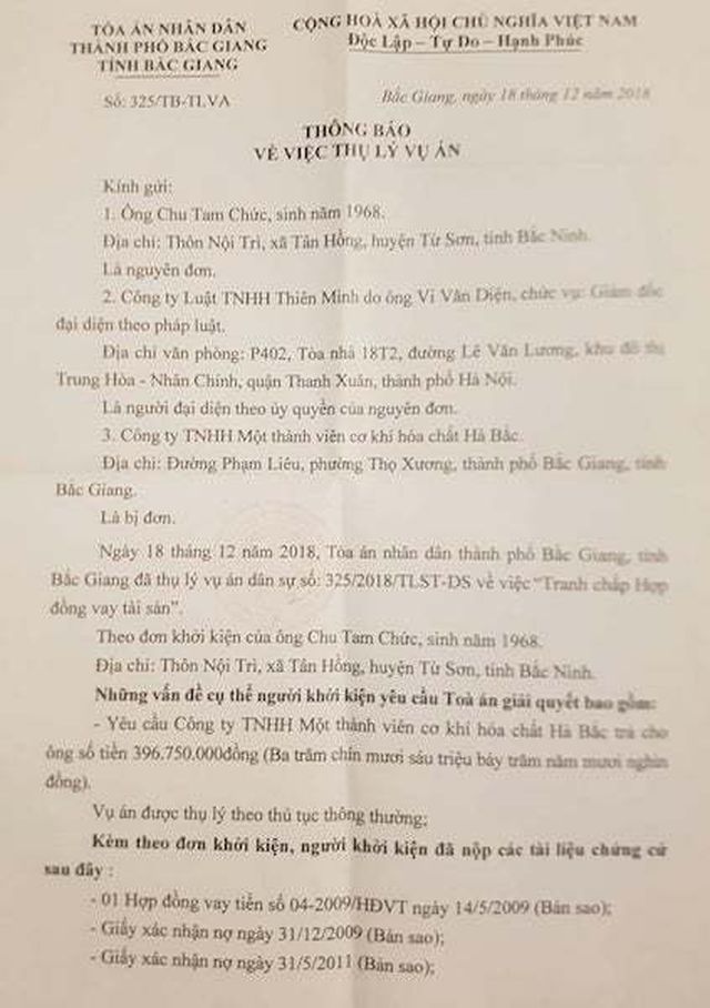 Trong đơn kêu cứu khẩn cấp gửi Báo Dân trí, ông Chu Tam Chức (SN 1968) trú tại khu phố Nội Trì, phường Tâm Hồng, TX Từ Sơn (Bắc Ninh) cho biết: Ngày 14/5/2009, Công ty cơ khí hoá chất Hà Bắc (nay là Công ty TNHH một thành viên cơ khí hoá chất Hà Bắc trực thuộc Tổng công ty xây dựng công nghiệp Việt Nam), địa chỉ tại phường Thọ Xương, TP Bắc Giang vay ông Chức 600 triệu đồng để sản xuất và kinh doanh với lãi suất 12%/năm.