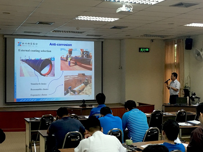 Ông Li Hua Cheng – chuyên gia kỹ thuật đại diện Công ty TNHH Ống gang cầu Xinxing tham gia diễn trình, bà Chomnaporn Sombun phụ trách phòng thiết kế và ông Pongsak Diaowilai phụ trách bộ phận kinh doanh Công ty cấp nước Chiang Mai số 9 PWA cùng hơn 50 cán bộ nhân viên của các phòng ban tham dự cuộc họp giao lưu kỹ thuật lần này. Ông Li Hua Cheng đã trình bày, phân tích chi tiết về kỹ thuật, lắp đặt, sửa chữa và những ưu điểm của Ống gang cầu so với những nguyên vật liệu khác dựa trên kiến thức lý thuyết, thao tác thực tế cũng như những công trình điển hình.