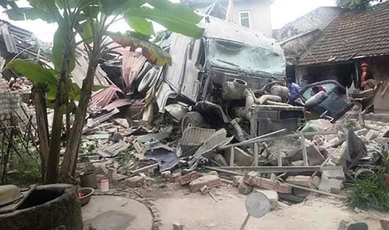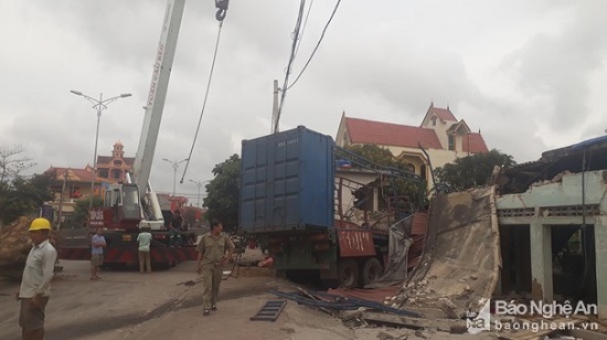 Hậu quả, chiếc ô tô container đã đâm đổ một loạt hộ lan, làm cong cột điện trước khi lao vào làm sập 3 nhà dân gồm hộ ông Hồ Sỹ Vượng, các bà Hồ Thị Tài và Nguyễn Thị Mỹ.