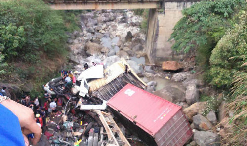 Hai chiếc xe container và ô tô khi xuống dốc do bất cẩn nên đã lao qua dải phân cách và rơi xuống suối.