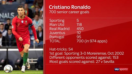 Những con số thống kê 700 bàn thắng của CR7. Ảnh: Sky sports |