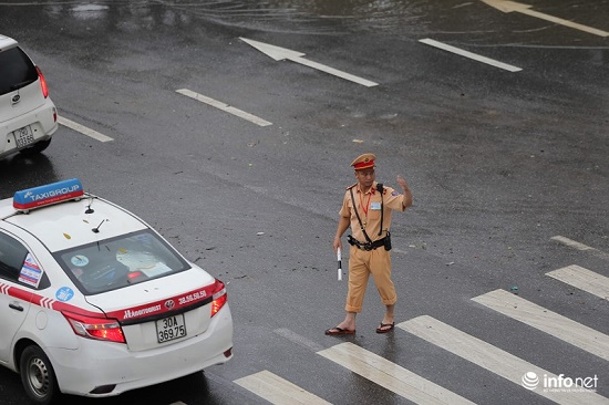 Lực lượng CSGT chân trần ngâm nước nhiều giờ đồng hồ để phân luồng giao thông tại các điểm ngập úng trên địa bàn thành phố Hà Nội do ảnh hưởng của bão số 3 và áp thấp nhiệt đới gây mưa lớn, nhiều nơi ngập nặng.
