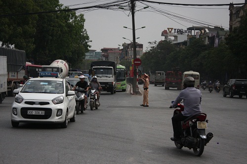 | Các chiến sỹ CSGT đội 14 đang làm nhiệm vụ phân làn tại nút giao thông Ngọc Hồi - Phan Trọng Tuệ. |