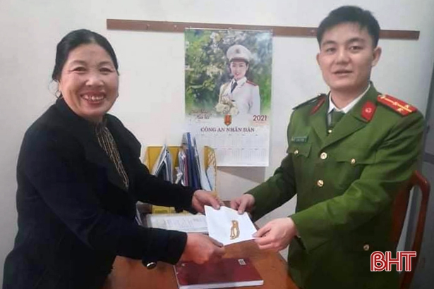 Chị Mai Thị Bình giao lại tài sản cho Công an phường Đức Thuận để tìm người đánh rơi. Ảnh: Báo Hà Tĩnh |