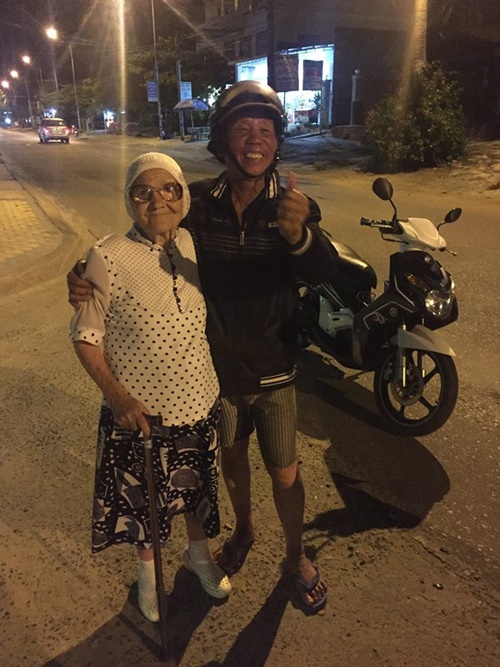 | Bác xe ôm phấn khởi chụp chung ảnh với cụ Lena. |