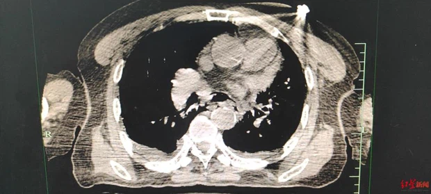 Bác sĩ Jiang Xiuquan, Phó Trưởng nhóm chuyên môn về Lồng ngực của Bệnh viện Nhân dân Thanh Bạch Giang (Thành Đô, Trung Quốc) cho biết, bệnh nhân được đưa vào viện lúc 6, 7 giờ tối, liên tục kêu đau tức ngực và đau âm ỉ vùng bụng trên. Người nhà cho biết vài tiếng trước khi nhập viện, ông đột ngột bị tức ngực, buồn nôn và nôn, chất nôn có màu nâu, mồ hôi nhễ nhại.