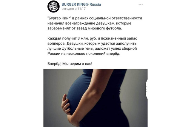 Cụ thể, nội dung quảng cáo của Burger King nói rằng: "Bất cứ cô gái nào có thể nhân rộng gen của các cầu thủ tốt nhất sẽ đảm bảo thành công cho đội tuyển quốc gia Nga trong vài thế hệ tới sẽ được nhận phần thưởng. Cố lên. Chúng tôi tin tưởng ở các bạn”.