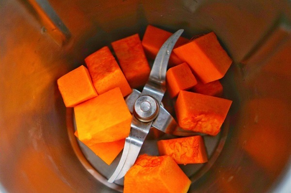 - Bước 3: Bí đỏ gọt vỏ, rửa sạch, thái khối. Tiếp đến, cho bí đỏ cùng 400ml nước lọc vào xay nhỏ.
