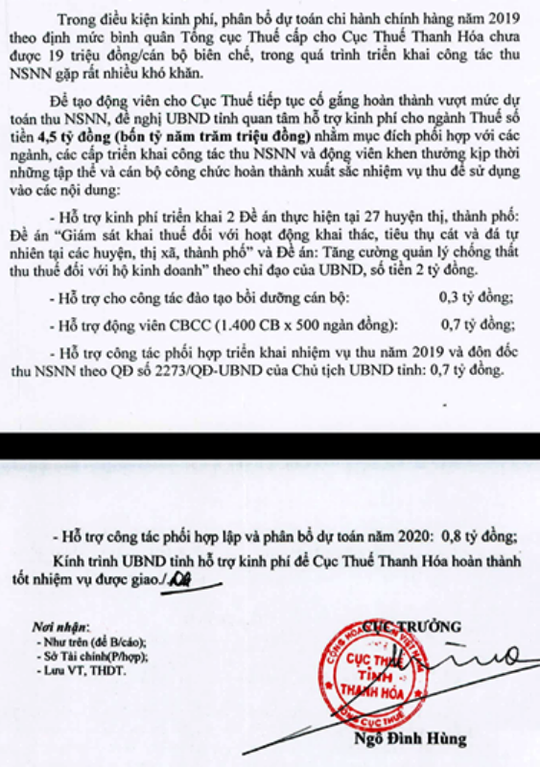 Tờ trình xin kinh phí hỗ trợ 4,5 tỉ đồng của Cục Thuế tỉnh Thanh Hóa. Ảnh: Người Lao động |