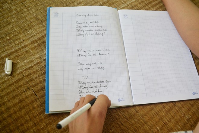 Hưng kể, nhiều hôm tập viết em như muốn buông xuôi vì quá khó. Nét chữ cứ nguệch ngoạc, trượt dài trên trang giấy. “Nhưng tập mãi rồi cũng quen, bây giờ em viết rất nhanh, chữ đẹp hơn trước nhiều rồi”, cậu bé tự hào nói. |