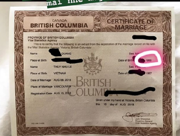 Cụ thể, cô chia sẻ lên trang cá nhân của mình bức ảnh chụp cận tờ giấy đăng ký kết hôn với bạn trai Việt Kiều. Anh chàng này tên Quang, mang quốc tịch Canada. Cặp đôi chính thức về chung một nhà vào ngày 15/8/2018 tại bang British Columbia, thành phố Victoria, Canada.