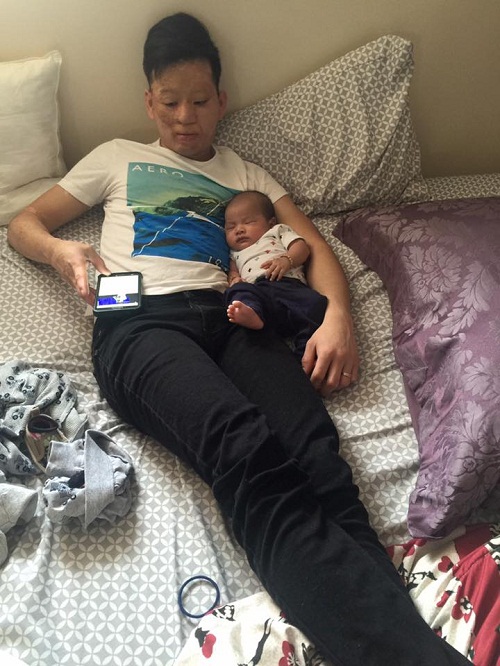 | Sau khi có con, người chồng luôn dành thời gian chăm sóc vợ và con trai. |