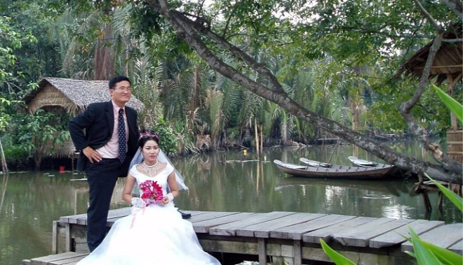 Một người đàn ông Hàn Quốc chụp ảnh cùng cô dâu Việt Nam. Ảnh: AP |