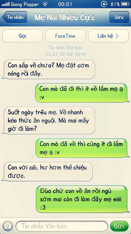 Tuy đây chỉ là những đoạn tin nhắn mang tính chất đùa vui nhưng không khó để nhận ra, đằng sau nó là sự thân thiết gắn bó sâu sắc của Giang Popper với mẹ cũng như tình cảm và yêu thương bao la mà mẹ Giang Popper dành cho con trai mình.