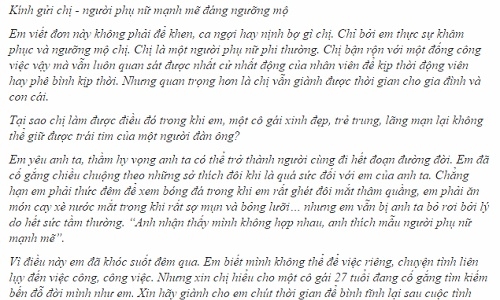 Vì điều này em đã khóc suốt đêm qua. Em biết mình không thể để việc riêng, chuyện tình liên lụy đến việc công, công việc. Nhưng xin chị hiểu cho một cô gái 27 tuổi đang cố gắng tìm kiếm bến đỗ đời mình như em. Xin hãy giành cho em chút thời gian để bình tĩnh lại sau cuộc tình kéo dài gần 3 năm mà kết thúc đẫm nước mắt chứ không hề có hậu này.