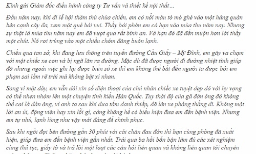 Chiều qua tan sở, khi đang lưu thông trên tuyến đường Cầu Giấy – Mỹ Đình, em gây va chạm với một chiếc xe con và bị ngã lăn ra đường. Mặc dù đã được người đi đường nhiệt tình giúp đỡ nhưng ngoài việc ghi lại được biển số xe thì em không thể bắt đền người ta được bởi em phạm sai lầm rẽ trái mà không bật xi nhan.