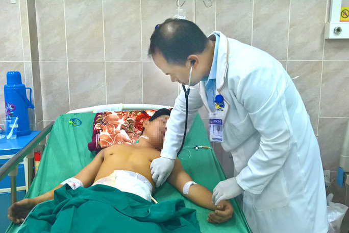 Theo Việt báo, các bác sĩ (BS) nhận định vết thương sâu đã làm đứt hoàn toàn gân cơ ở thành bụng, đứt và rách nhiều nơi ở ruột non. Mạc treo ruột cũng bị rách đang chảy máu. Các BS nhanh chóng làm sạch vết thương, cầm máu và cắt bỏ đoạn ruột non bị tổn thương nặng, khâu những vùng ruột non bị rách, đưa đại tràng xích – ma ra da làm hậu môn tạm.