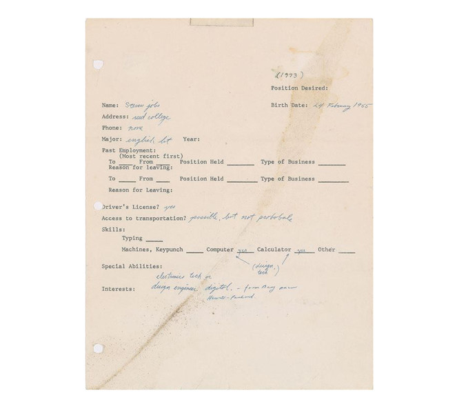 Jobs nộp đơn xin việc sau khi bỏ dở khóa học tại cao đẳng Reed (Reed College) mà ông mới nộp đơn xin học trước đó một năm. Jobs đã dành một năm rưỡi để theo đuổi khóa học viết chữ đẹp, khiêu vũ và tập kịch Shakespeare trước khi viết đơn xin việc này.