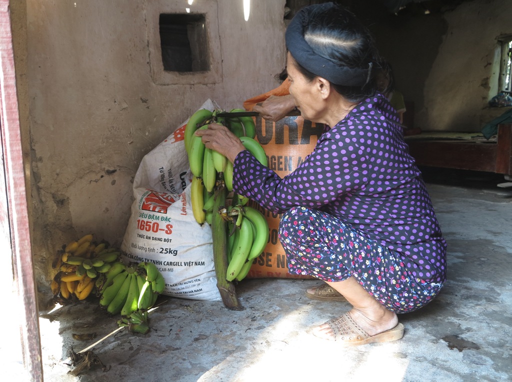 | Bà Ngân cố gắng “bòn” những nải chuối, mớ rau trong vườn để đưa ra chợ bán mong kiếm được chút tiền mua thuốc cho cháu gái. |