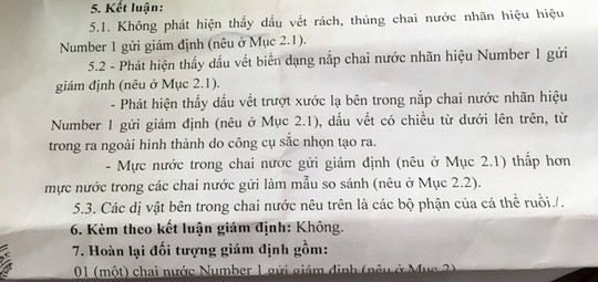 Kết luận của Viện Khoa học hình sự về chai nước Number One có ruồi. Ảnh Người lao động. |