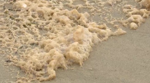 Bọt biển đọng lại trên cát có màu vàng. Ảnh TN |