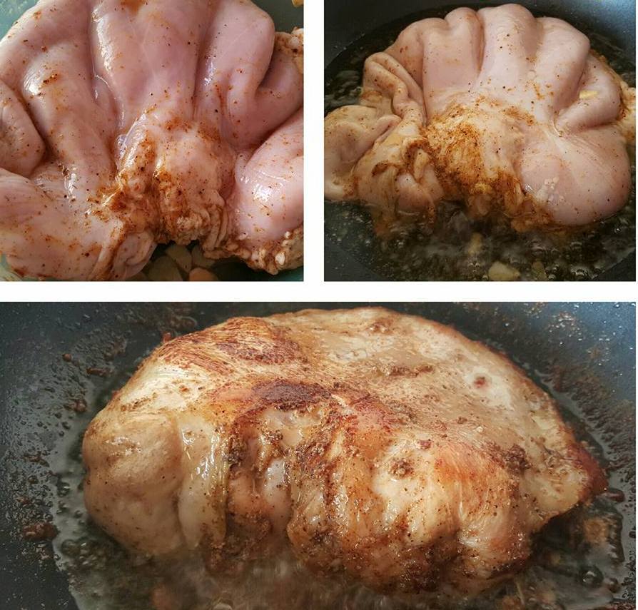 - Chiên vàng dạ dày với nhiều dầu ăn, khi chiên nhớ lật dạ dày lại mặt phải. Sau đó chắt bỏ hết dầu ăn đi, rồi đổ nước dừa vào om.
