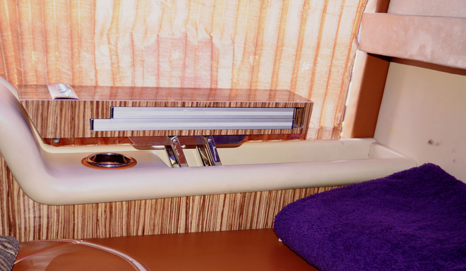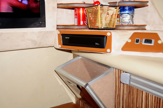 | Ngay dưới tivi cũng có một hộc nhỏ, giúp hành khách chứa tối đa mà không phải chiếm dụng không gian của giường. |