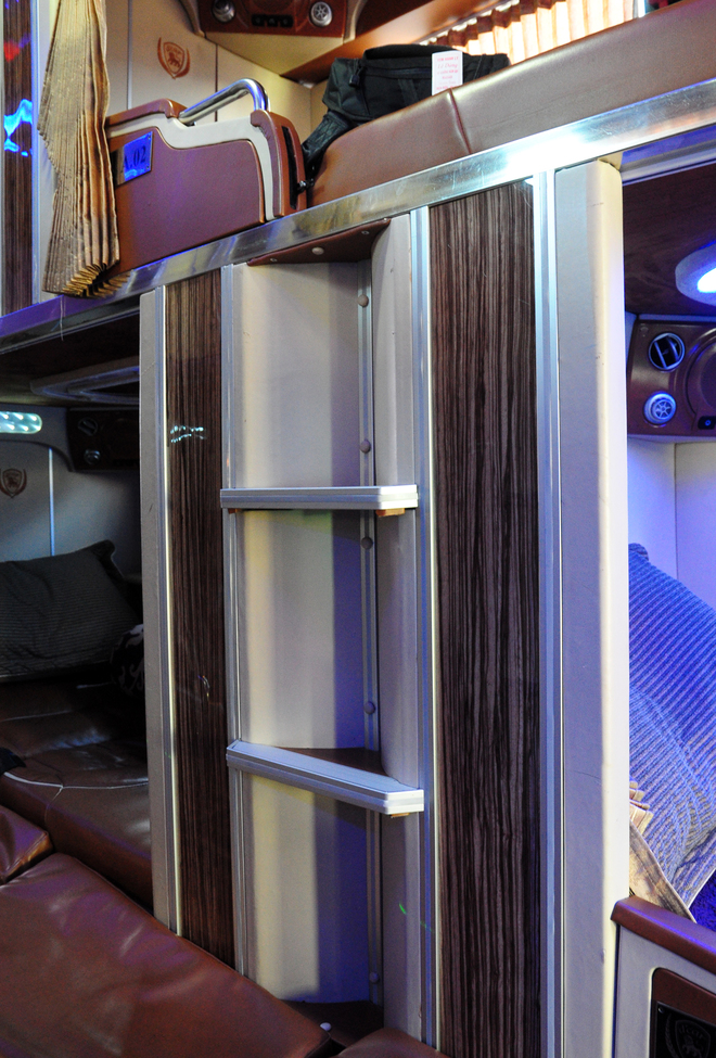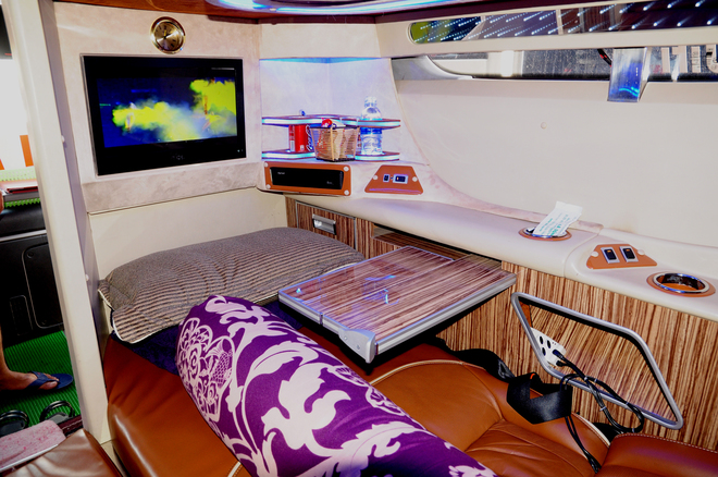 | Không gian ấm áp với ánh sáng dịu đủ các loại màu. Tổng số tiền mua xe và thay đổi thiết kế nội thất lên tới 7 tỷ đồng. Mức giá cho một chiều vào khoảng 650.000 đồng mỗi hành khách. Các giường có không gian riêng tư, ngăn cách nhau bởi màn che. |