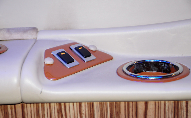 | Phía trên đầu người là loa, khe điều hòa và đèn tùy chỉnh. Bàn ăn nhẹ hoặc để máy tính làm việc. |