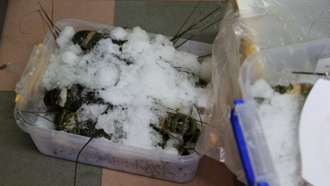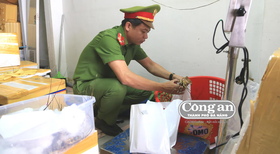 Cảnh sát Môi trường lấy mẫu tôm hùm để kiểm tra tạp chất. Ảnh: Công an TP.Đà Nẵng |