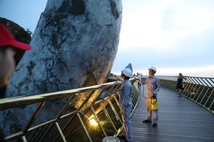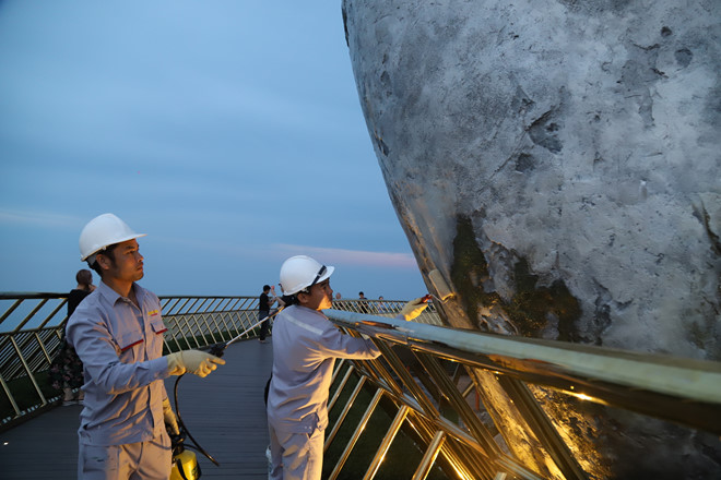 Tròn một ngày sau khi cầu Vàng Đà Nẵng bị vẽ bậy, các công nhân của khu du lịch Sun World Ba Na Hills đã nhanh chóng dùng sơn màu xám để che đi dòng chữ xấu xí mà du khách để lại trên cầu.