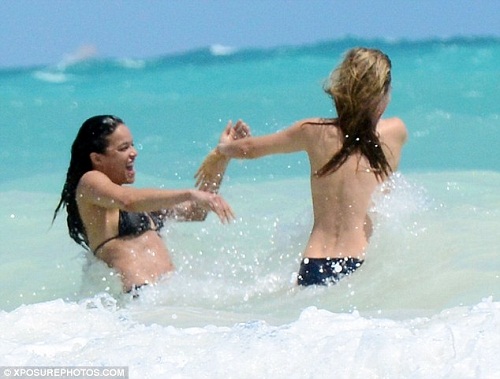 Thỉnh thoảng siêu mẫu Cara cũng ngại ngùng như khi cô lấy tay che ngực khi 2 người lên bờ biển. | Cả hai nô đùa, té nước lên người nhau thật hạnh phúc. | | Cara không muốn bị cháy nắng in hình áo ngực lên người nên cô đã thả rông ngực bên người tình. |