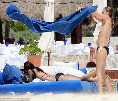 Sau khi ngâm mình dưới làn nước biển xanh biếc, cặp đôi quay trở lại ghế xếp để tắm nắng. | Để tránh ánh nắng mặt trời in hình áo ngực trên người ở bãi biển Caribbean, Cara đã để ngực trần và thi thoảng dùng tay che ngực, trong khi đó tình yêu mới của cô mặc bộ bikini hai mảnh màu đen quyến rũ.