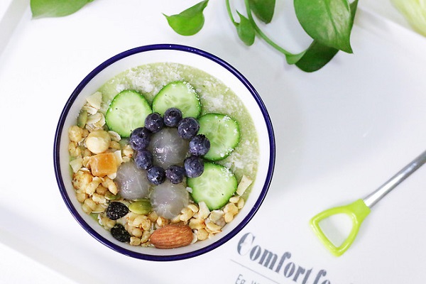 - Bước 3: Đổ sinh tố ra bát, thêm dưa chuột thái lát, nhãn, việt quất và ngũ cốc ăn liền lên trên là xong.