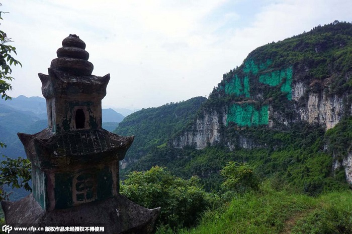 Đây là công trình điên rồ của Yang Zhigang, tại quận Kỳ Giang, thành phố Trùng Khánh, Trung Quốc. Nhóm thợ mà anh ta thuê để sơn núi gồm 5-6 người với dây thừng bảo hộ buộc ngang lưng và những bình phun sơn.