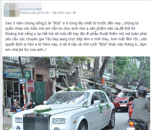 “Sau 3 năm chung sống, em là "đứa" anh ở cùng lâu nhất từ trước đến nay... Chúng ta quần nhau các kiểu mà em vẫn không chịu sinh cho anh sản phẩm nào cả. Đã thế thi thoảng trái nắng em lại hắt hơi sổ mũi, rất hay đòi đi phẫu thuật thẩm mỹ mà toàn phải yêu cầu các chuyên gia Tây bay sang trực tiếp làm em mới chịu. Anh mệt lắm rồi... nên quyết định ly hôn em từ hôm nay.. Anh sẽ ở vậy và chờ cưới "đứa" khác vào tháng 6...Bye em nhé, bé bự của anh..!”