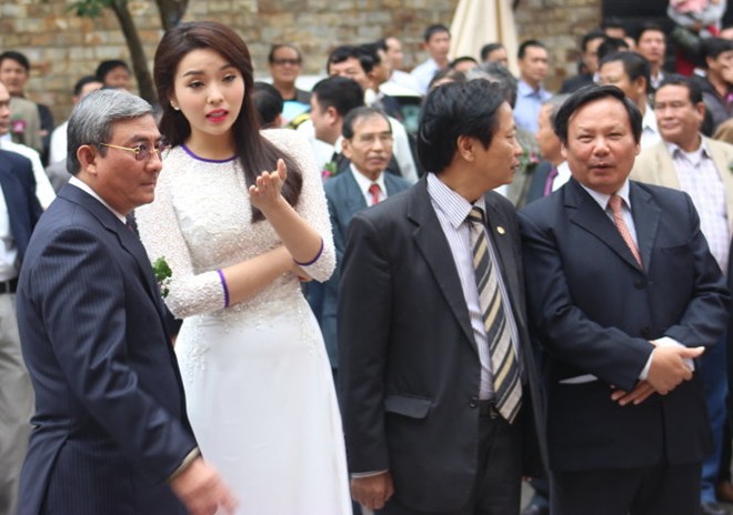 Ông Nguyễn Văn Hùng (người đeo kính, đang nói chuyện với hoa hậu Kỳ Duyên) trong dịp khai trương khách sạn 5 sao Hai Bà Trưng ở TP.Buôn Ma Thuột (Đắk Lắk) tháng 1/2015. Ảnh: Tuổi trẻ. |