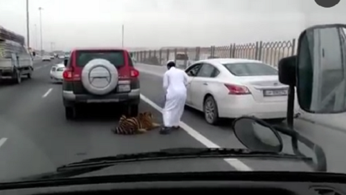 Mới đây, trên mạng xã hội truyền tay nhau một đoạn clip ghi lại cảnh một con hổ lớn làm nũng, nằm ỳ giữa đường ở Thủ đô Doha khiến chủ của nó gặp không ít rắc rối.