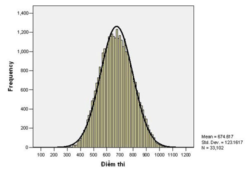 Trao đổi với báo VnExpress, ông Nguyễn Quốc Chính (Giám đốc Trung tâm Khảo thí và Đánh giá chất lượng đào tạo) cho biết, phân bố điểm có dạng chuẩn, trung bình là 674 và bài thi cao nhất đạt 1078 điểm (thang điểm 1200).