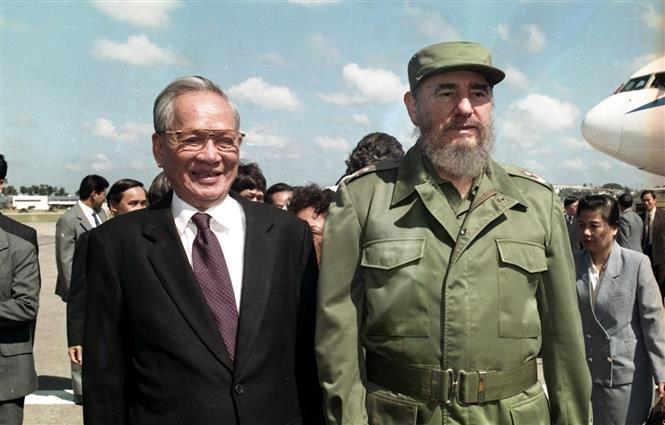 Chủ tịch Cuba Fidel Castro đón Chủ tịch nước Lê Đức Anh tại sân bay quốc tế José Martí ở thủ đô La Habana, trong chuyến thăm hữu nghị chính thức Cuba từ 12 - 17/10/1995. Ảnh: Cao Phong/TTXVN. |