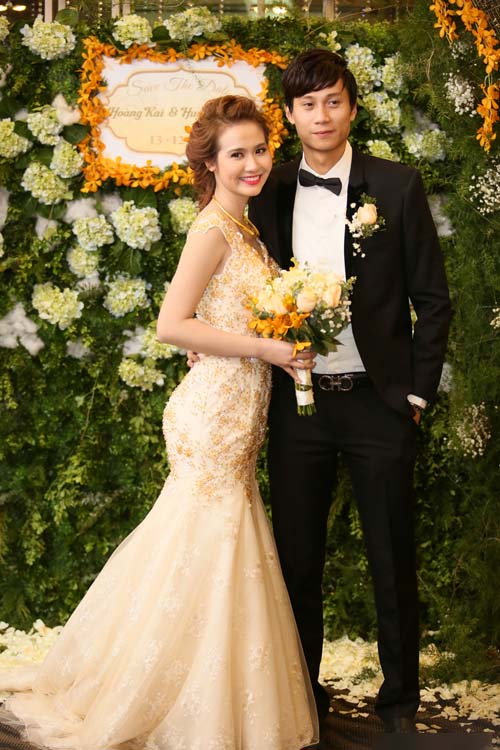 Cô diện chiếc váy cưới tone màu vàng nhạt nổi bật và thu hút mọi ánh nhìn. Nụ cười rạng rỡ vẫn luôn nở trên môi của cặp đôi và gia đình.