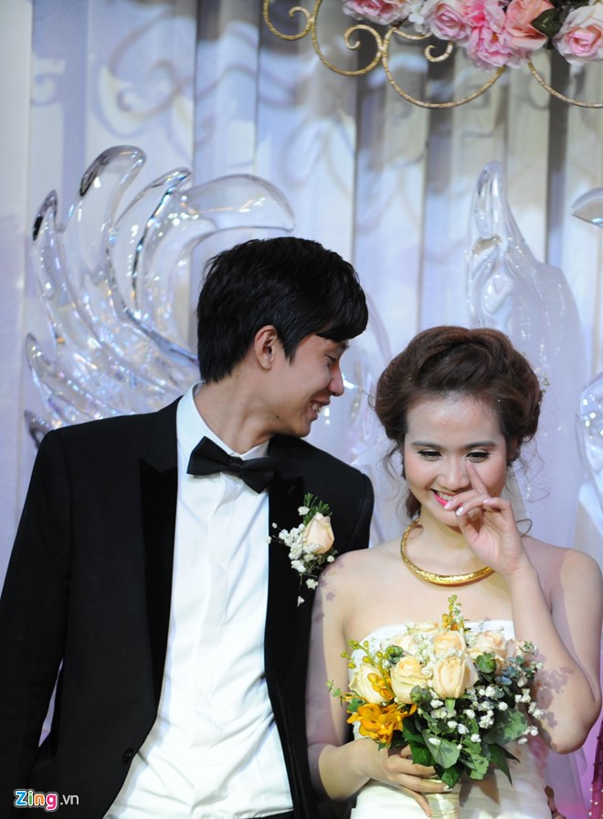 Đến giờ cử hành hôn lễ, cô dâu nhanh chóng thay sang chiếc váy cưới màu trắng, dáng quây, khoe đôi vai trần mịn màng. Cặp tân lang tân nương hồi hộp trước khi tiến vào khán phòng. |