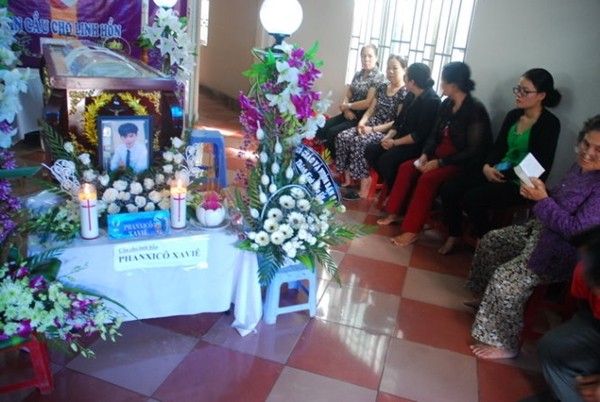 Lễ tang của Q. được kết trắng hoa huệ. Phía sau những hàng hoa trắng tinh khôi, bức hình kỷ niệm chụp lúc Q. còn sống được sử dụng để làm di ảnh.