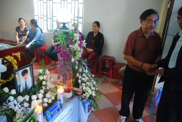 Nhiều người đến chia buồn không cầm được lòng trước hình ảnh một chiếc quan tài được đặt giữa nhà, bên cạnh là một người đàn ông lớn tuổi đứng run run nhìn người đến thăm.