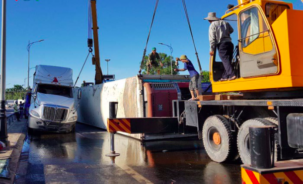 Khoảng 3h ngày 27/7, trên Quốc lộ 1A, khu vực cầu Đông Hà, tỉnh Quảng Trị vừa xảy ra tai nạn giao thông khiến xe container lật ngang đường.