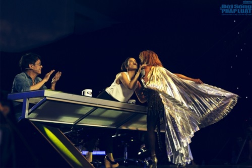 | Hai nam ca sĩ không ngại hôn má nhau trước đông đảo khán giả. |