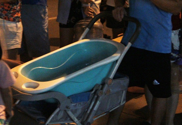 Một ông bố còn tận dụng chiếc bồn tắm của con mình đi lấy nước sạch - Ảnh: Gia đình & Xã hội |