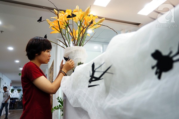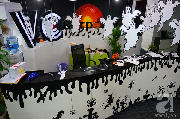 Có những văn phòng chỉ được trang trí những góc nho nhỏ như góc giải trí, bàn ăn hoặc bàn làm việc của cá nhân theo phong cách lễ hội ma; nhưng cũng có những công sở ngập tràn không khí rùng rợn của mùa Halloween với đủ loại hình nộm, hình trang trí cầu kỳ, thậm chí, họ còn không ngần ngại trang trí cả... quầy lễ tân.